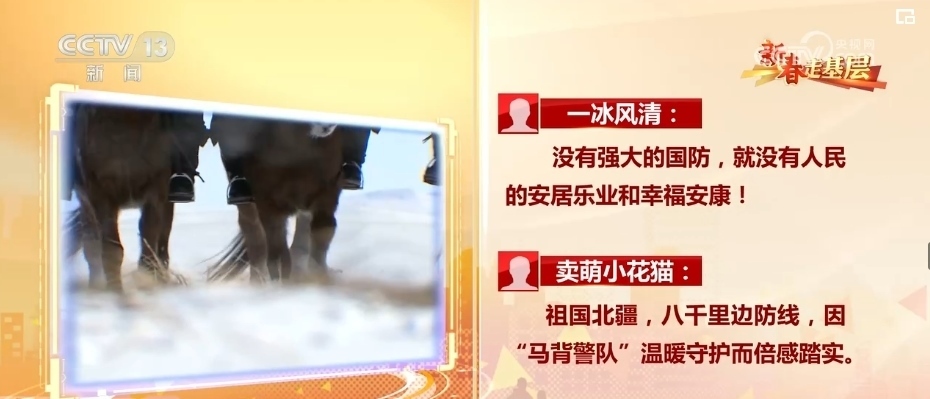 《新春走基層·馬背警隊:風(fēng)雪中的溫暖守護(hù)》播出后,有網(wǎng)友說:“沒有強(qiáng)大的國防,就沒有人民的安居樂業(yè)和幸福安康!”。也有網(wǎng)友說:“祖國北疆,八千里邊防線,因“馬背警隊”溫暖守護(hù)而倍感踏實?!?br>