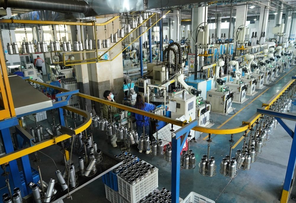 這是2023年12月21日在浙江省永康市一家保溫杯生產(chǎn)企業(yè)拍攝的自動(dòng)化生產(chǎn)流水線。新華社記者 韓傳號 攝