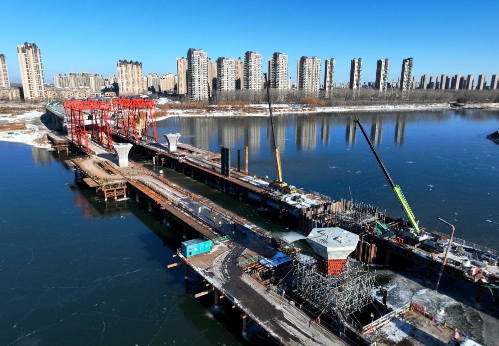 這是廠通路(河北省大廠回族自治縣至北京市通州區(qū))潮白河大橋施工現(xiàn)場(chǎng)(2023年12月21日攝,無人機(jī)照片)。新華社記者 王曉 攝