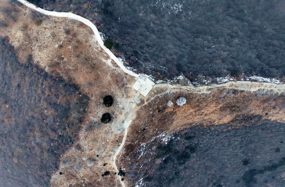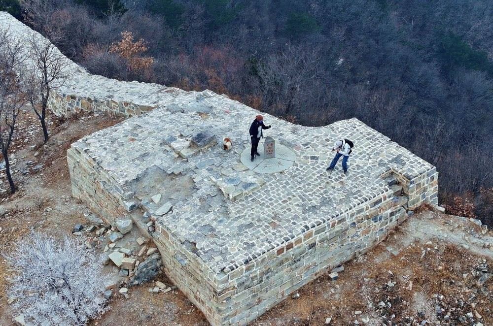 這是位于北京平谷、天津薊州、河北承德交界處的三界碑,以長(zhǎng)城和山脊為界劃分出北京、天津和河北三地(2024年1月30日攝,無人機(jī)照片)。新華社記者 趙子碩 攝