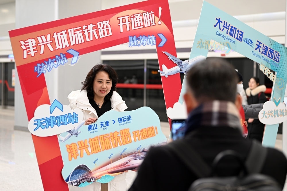 2023年12月18日,旅客在大興機(jī)場(chǎng)站拍照留念。當(dāng)日,津興城際鐵路正式開通運(yùn)營(yíng)。新華社記者 李然 攝