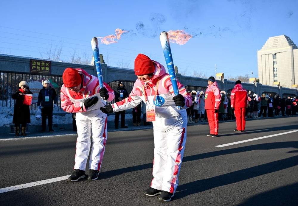 ??2月3日,在內(nèi)蒙古呼倫貝爾市滿(mǎn)洲里國(guó)門(mén)景區(qū),火炬手包玲玲(右)和錢(qián)卓在火炬?zhèn)鬟f活動(dòng)中。新華社記者 連振 攝