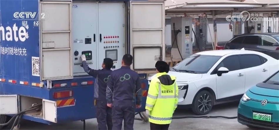 某新能源科技有限公司市場部經(jīng)理 霍國慶:一次可以保障四臺車,一天(一臺充電車能充)100多臺車次,再帶上這邊的固定樁,基本上能滿足保定服務(wù)區(qū)使用。