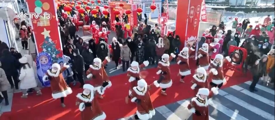 在黑龍江同江市的中俄年貨大集上,不僅有當?shù)靥厣膬鲷~、凍梨、凍柿子,還有俄羅斯的大列巴、巧克力等美食。逛吃的同時,現(xiàn)場還能欣賞各具特色的中俄文藝表演,讓趕集的人一飽眼福。