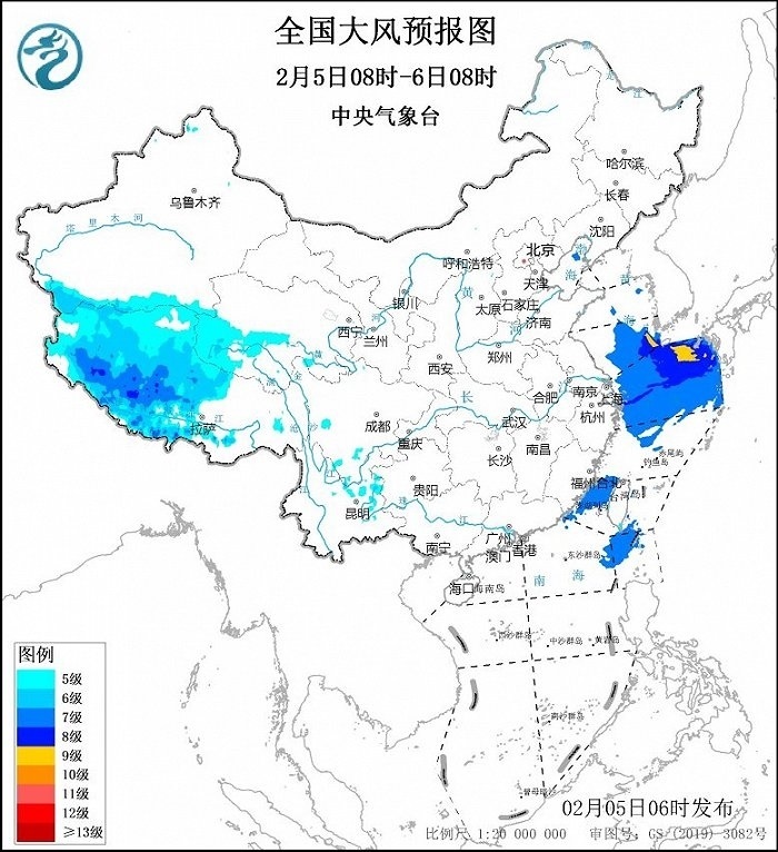 預(yù)計,2月5日08時至6日08時,西藏中西部、青海西南部等地將有5~7級、陣風8級的大風;黃海南部海域、東海大部海域、臺灣海峽、巴士海峽將有7~8級、陣風9級的大風,其中黃海東南部、東海東北部的部分海域風力可達9級、陣風10級。