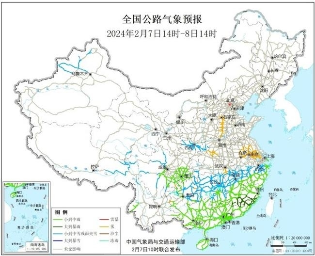 圖3 全國(guó)公路氣象預(yù)報(bào)圖(2月7日14時(shí)-8日14時(shí))