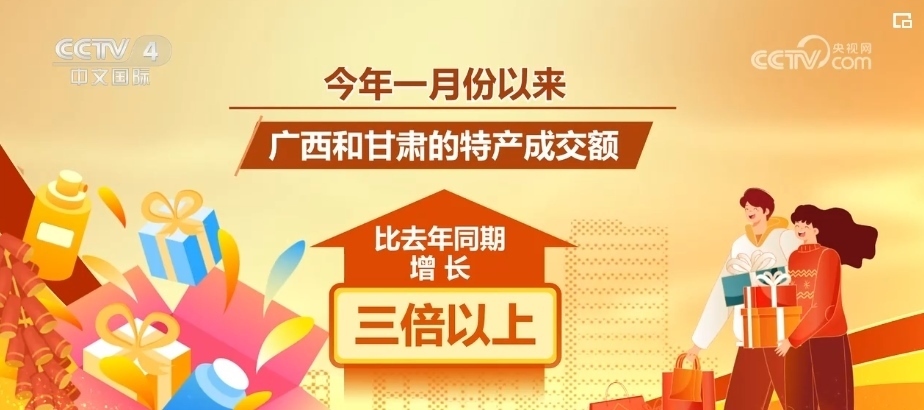 各大商場、超市、線上平臺均迎來銷售高峰。某購物平臺數據顯示,2024年1月份以來,廣西和甘肅的特產成交額比同比增長了三倍以上。廣西的砂糖橘、羅漢果茶,甘肅的蓋碗茶、百合干格外火熱。河南、天津、貴州等10個省份的特產成交額同比增長了一倍以上。