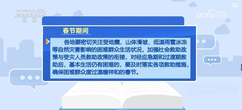 各地要密切關(guān)注受地震、山體滑坡、低溫雨雪冰凍等自然災(zāi)害影響的困難群眾生活狀況,加強(qiáng)社會(huì)救助政策與受災(zāi)人員救助政策的銜接,對經(jīng)應(yīng)急期和過渡期救助后,基本生活仍有困難的,要及時(shí)落實(shí)各項(xiàng)救助措施,確保困難群眾度過溫暖祥和的春節(jié)。