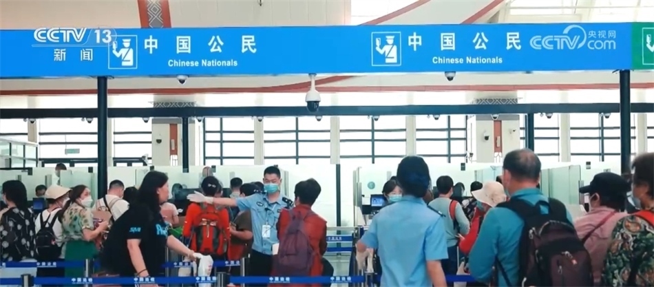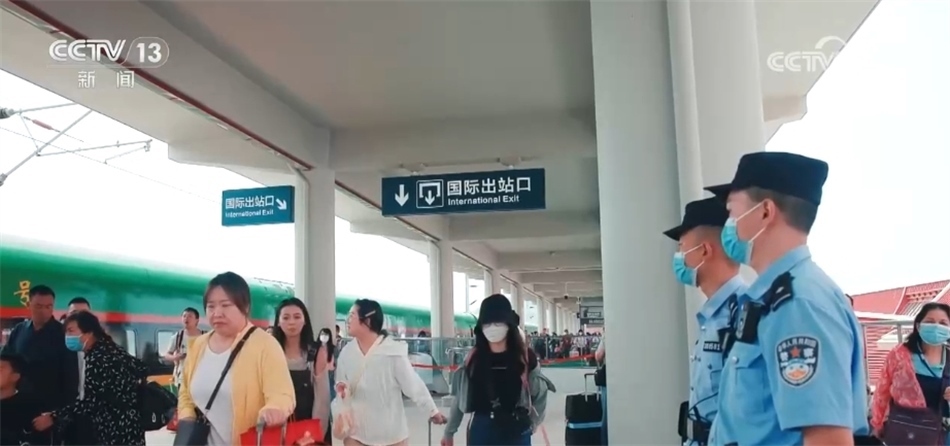 在磨憨站,出入境人員熙熙攘攘,異常熱鬧,來自不同國家和地區(qū)的旅客有序通過國際安檢區(qū)并經(jīng)海關(guān)查驗后,在磨憨邊檢站鐵路口岸執(zhí)勤專班民警指引下排隊、核驗證件,順利通關(guān)。