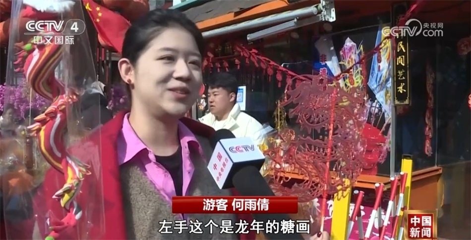 游客何雨倩在接受記者采訪時說:“逛廟會,過大年,今天最大的驚喜就是看到了這么多的非遺項目,我右手這個是龍年的生肖面人,左手這個是龍年的糖畫,特別適合打卡,真是太有年味了。”
