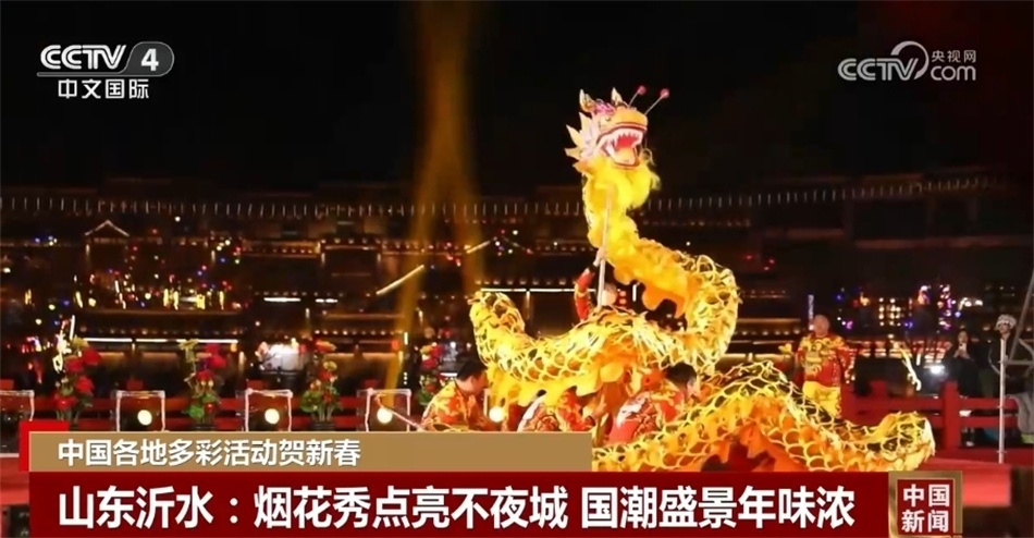 在山東沂水,穿越云端的煙花秀點(diǎn)亮了沂水彩虹不夜城的天空,喧天的鑼鼓、歡騰的舞龍、熱鬧的氣氛搭配著“有鳳來儀”“盛彩敦煌”等隨處可見的國潮盛景,仿佛讓人穿越千年。