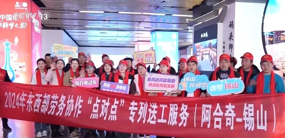 在江蘇無(wú)錫,用工企業(yè)早早來(lái)到火車(chē)站口,迎接首批新疆務(wù)工人員的到來(lái)?!包c(diǎn)對(duì)點(diǎn)”大巴車(chē)將員工直接送到企業(yè)門(mén)口。