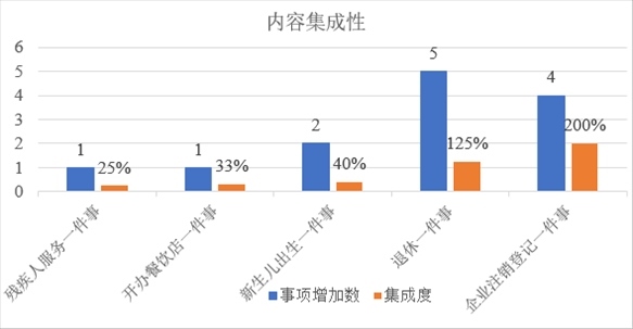 從內(nèi)容集成度看,5項相關(guān)“一件事”的事項集成比例均有不同程度提升?!皻埣踩朔?wù)一件事”增加1個事項,集成度提升25%。“開辦餐飲店一件事”增加1個事項,集成度提升33%?!靶律鷥撼錾患隆痹黾?個事項,集成度提升40%?!巴诵菀患隆痹黾?個事項,集成度提升125%?!捌髽I(yè)注銷登記一件事”增加4個事項,集成度提升200%。