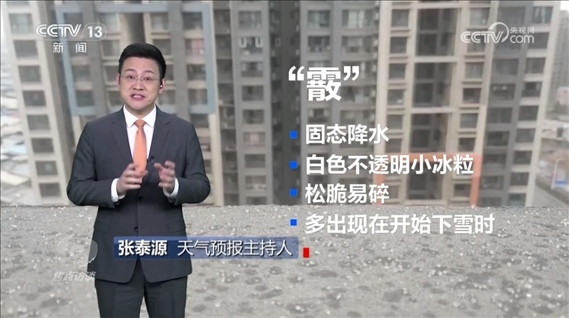 天氣預報主持人張?zhí)┰矗骸啊薄且环N固態(tài)降水,由白色不透明的小冰粒組成,近似球形,有時呈圓錐形,有雪狀結構,通常在地面氣溫不太冷時降落,在剛開始下雪的時候出現(xiàn)?!?/p>