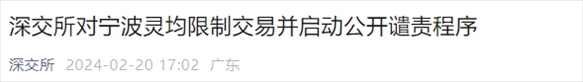 根據(jù)深交所《限制交易實(shí)施細(xì)則》《自律監(jiān)管措施和紀(jì)律處分實(shí)施辦法》等相關(guān)規(guī)定,深交所決定,從2024年2月20日起至2024年2月22日止對(duì)寧波靈均名下相關(guān)證券賬戶采取限制交易措施,限制其在上述期間買(mǎi)賣在深交所上市交易的所有股票,并啟動(dòng)對(duì)寧波靈均公開(kāi)譴責(zé)紀(jì)律處分的程序。