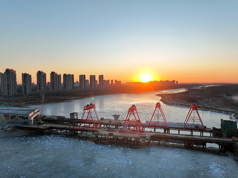 1月15日拍攝的建設(shè)中的廠通路潮白河大橋(無(wú)人機(jī)照片)。新華社記者 邢廣利 攝
