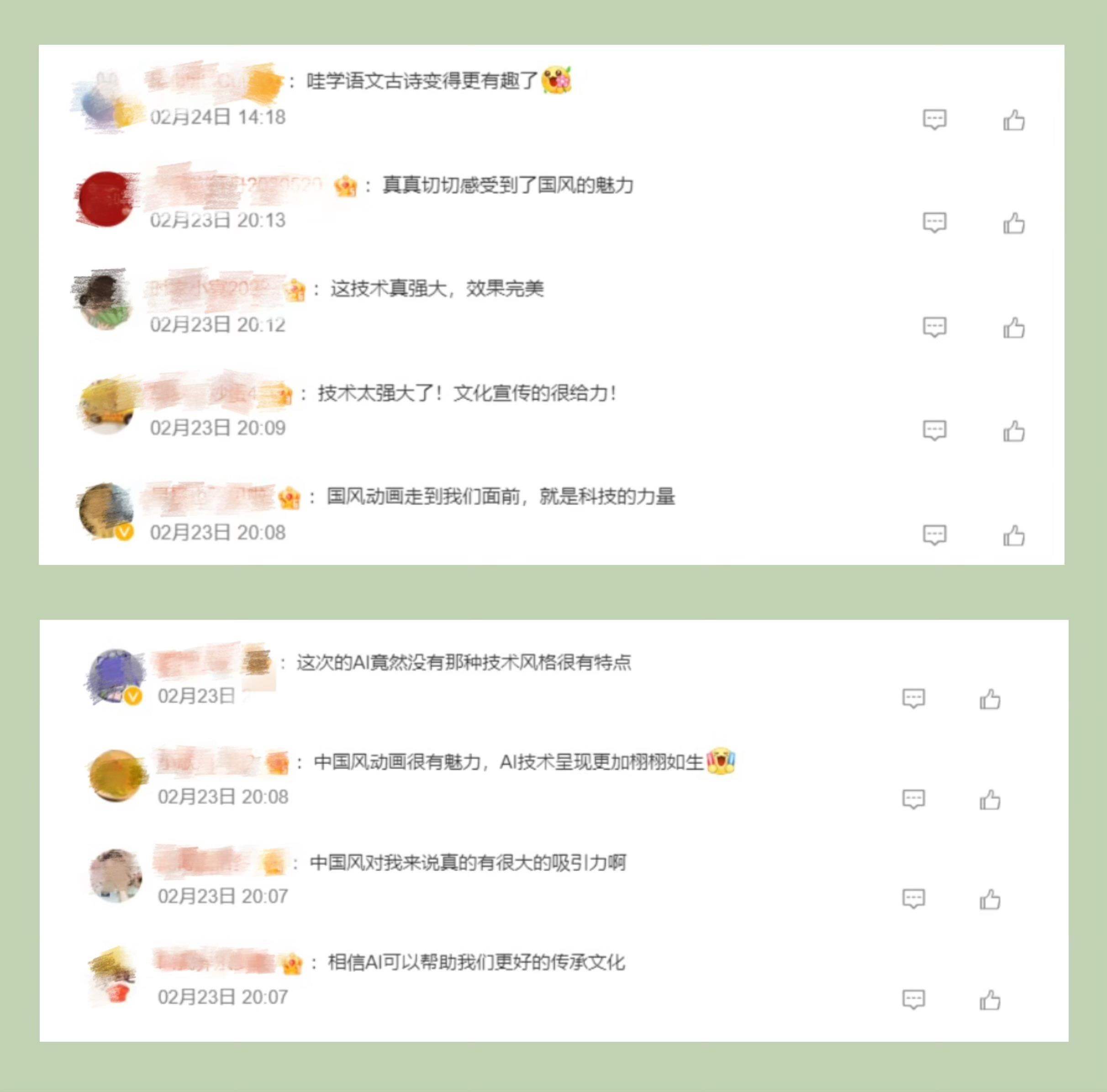 節(jié)目探索詩畫融通的國風(fēng)動畫片新呈現(xiàn),讓廣大青少年進(jìn)一步加深了對中國經(jīng)典詩詞的理解和喜愛?!癆I”“總臺”“千秋詩頌”等成為網(wǎng)友熱議高頻詞。截至2月27日20:00,話題#千秋詩頌#閱讀量超791萬次。網(wǎng)友紛紛留言:“看到這個系列片,我真的深深感受到了中國傳統(tǒng)文化的深厚底蘊(yùn)。這些古詩詞深入骨髓,流淌在我們的血液中,是我們國家的文化符號”“以AI為媒,央視制作的這部國風(fēng)動畫片傳承了經(jīng)典,喚醒了古韻的新生命”“唯美的畫面讓人動容,用視覺的形式了解《別董大》這一首古老的詩歌更別有一番韻味”“這種科技與動畫片的結(jié)合,恰好是現(xiàn)在小朋友們和大朋友們所需要的”。