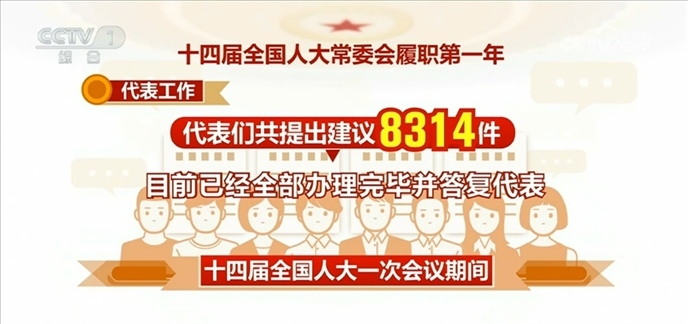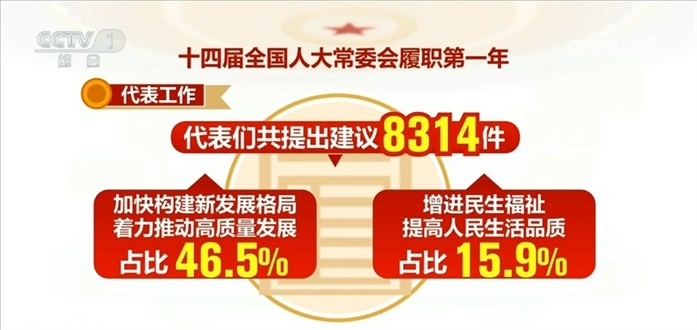 代表工作方面:十四屆全國人大一次會議期間,代表們共提出建議8314件,目前已經(jīng)全部辦理完畢并答復代表。其中,涉及加快構建新發(fā)展格局、著力推動高質(zhì)量發(fā)展的占比46.5%,涉及增進民生福祉、提高人民生活品質(zhì)的占比15.9%。