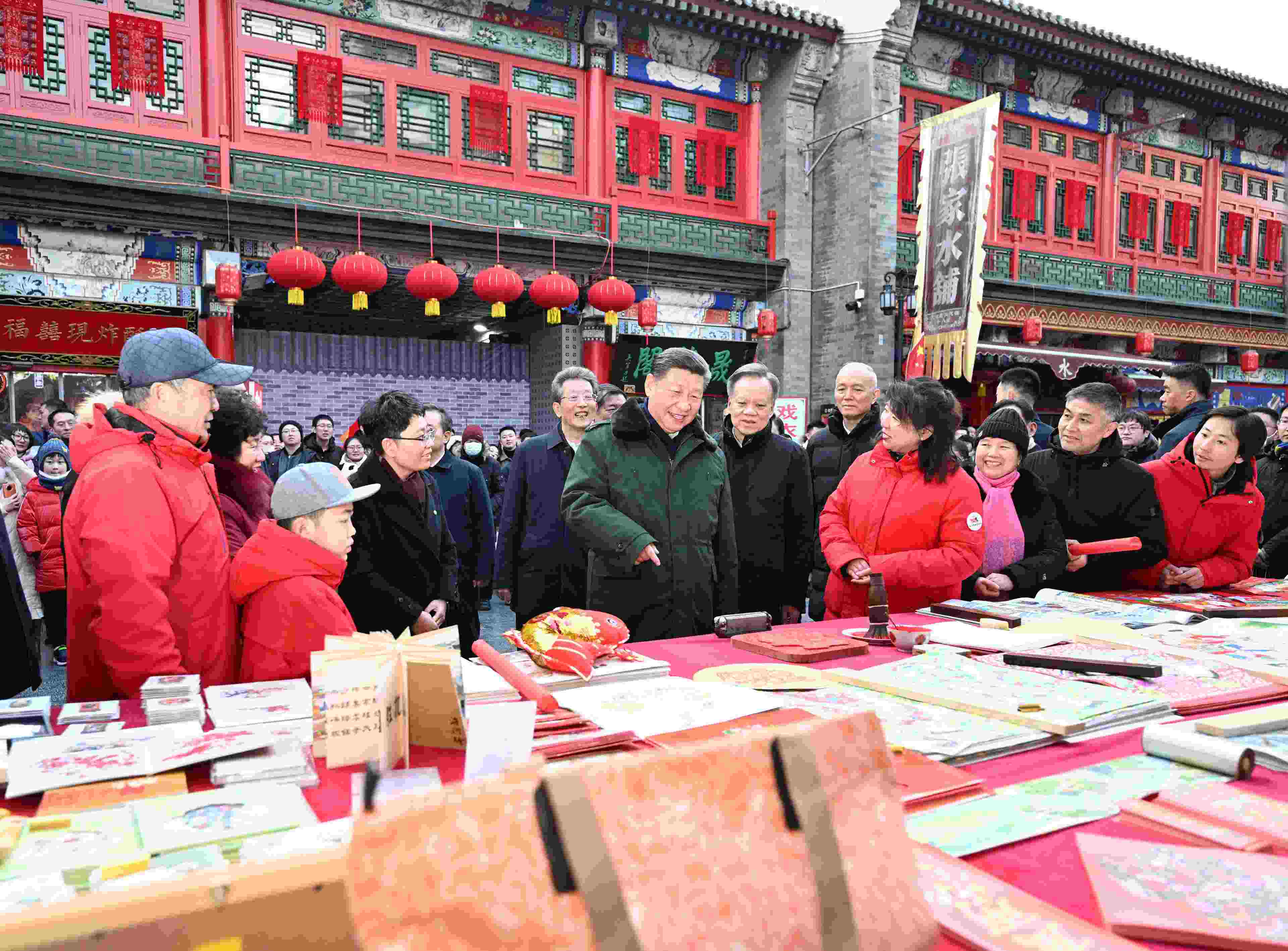 2月1日下午,總書記出現(xiàn)在了素有“津門故里”之稱的天津古文化街。在這個天津最早的經(jīng)濟、文化、商貿(mào)聚集地,總書記考察了歷史悠久的桂發(fā)祥十八街麻花、果仁張、泥人張、楊柳青年畫等“老字號”店鋪,向小朋友贈送麻花和栗子羹等天津特色傳統(tǒng)小吃,與群眾一起欣賞喜氣騰騰的“津味中國年”表演,看政通人和,品文脈傳承,溫故而知新。