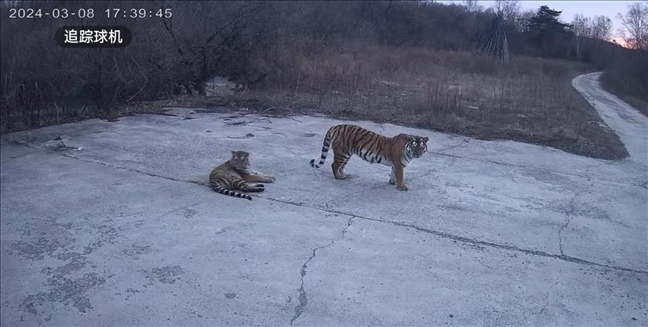 ·吉林延邊四只東北虎在魚塘旁游蕩,當(dāng)?shù)兀阂淹ㄖ迕褡⒁狻?/span>
