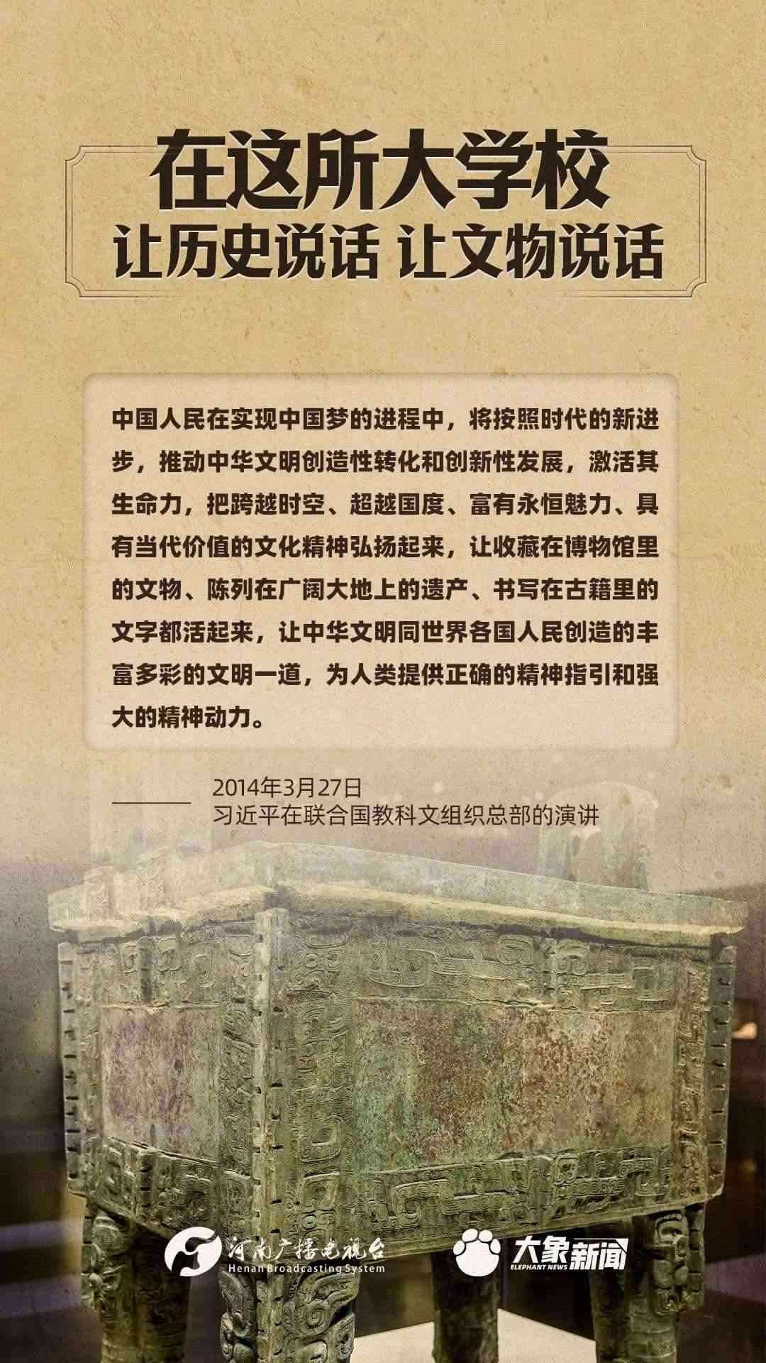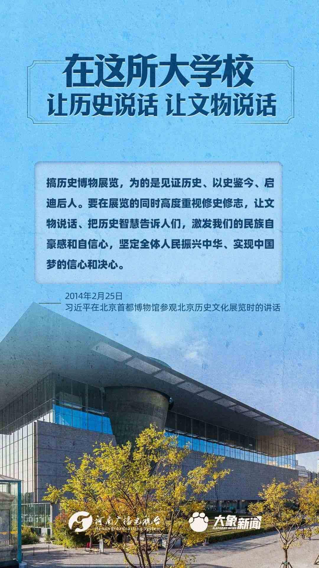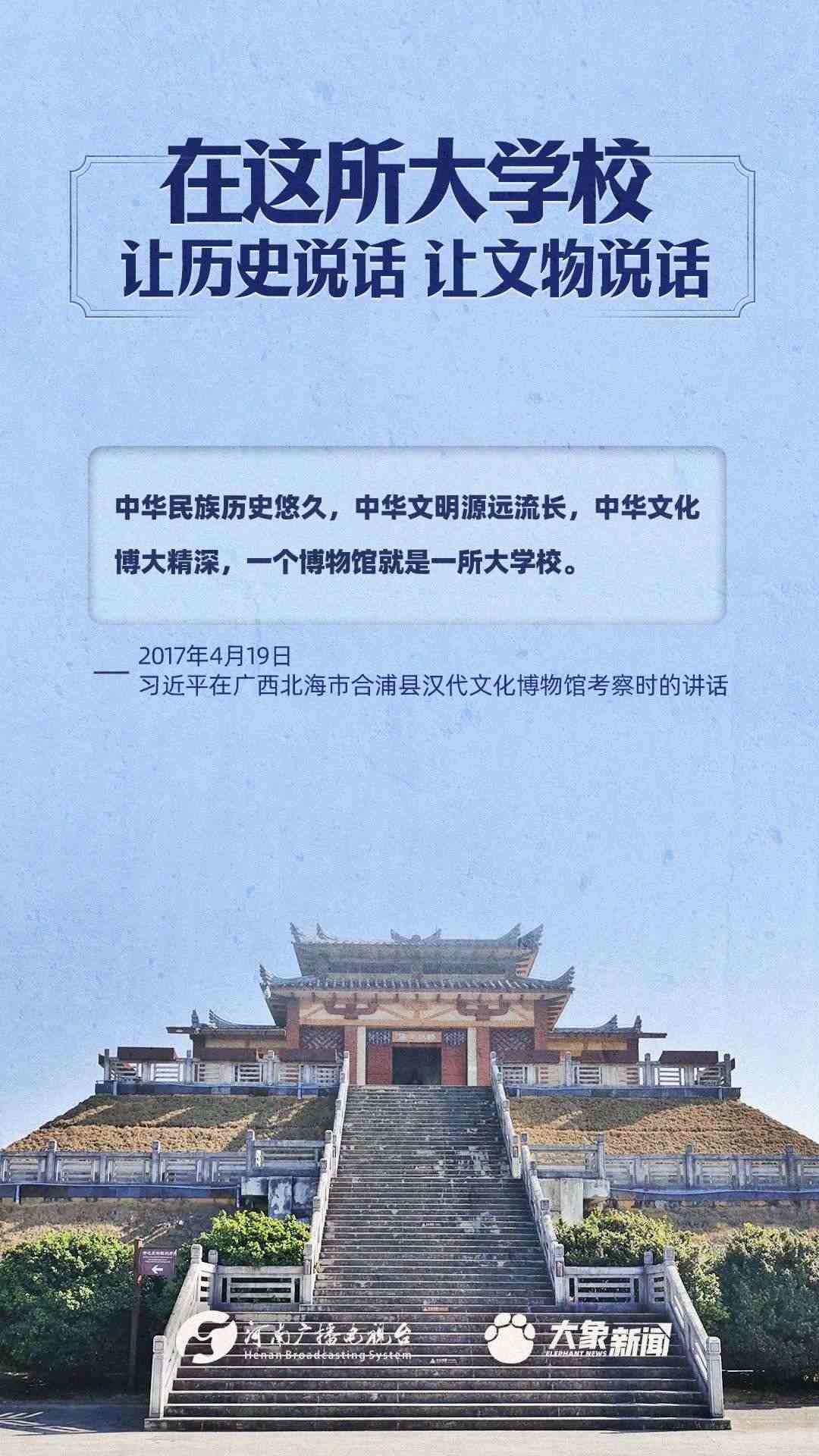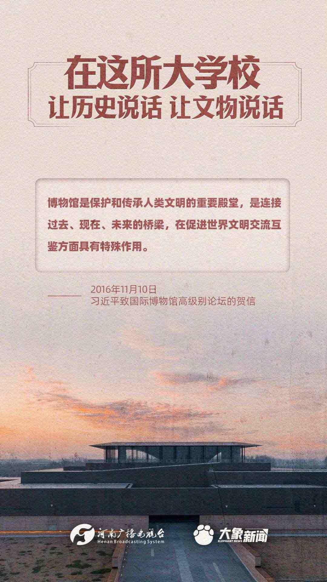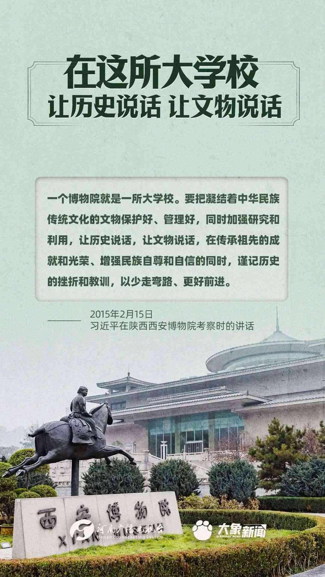 習(xí)近平總書(shū)記一直高度重視博物館工作,多次作出重要講話,強(qiáng)調(diào)“一個(gè)博物院就是一所大學(xué)校”,指出“讓歷史說(shuō)話,讓文物說(shuō)話”,要求“守護(hù)好、傳承好、展示好中華文明優(yōu)秀成果”等等,金句連連。大象新聞進(jìn)行了認(rèn)真梳理,邀您一起學(xué)習(xí)。