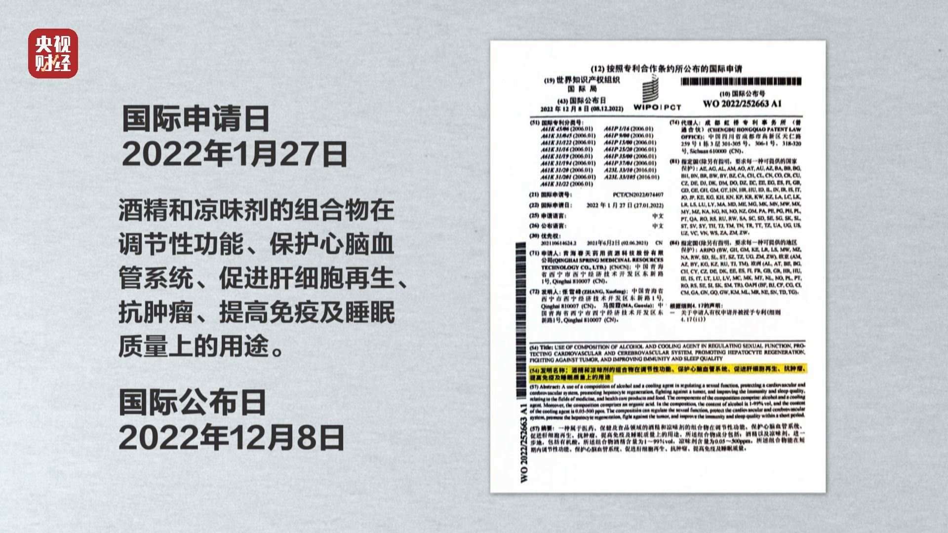 聽花酒申請(qǐng)的專利到底是什么?根據(jù)聽花酒公開資料顯示,2022年1月27日,聽花酒申請(qǐng)的國際專利,名稱為《酒精和涼味劑的組合物在調(diào)節(jié)性功能、保護(hù)心腦血管系統(tǒng)、促進(jìn)肝細(xì)胞再生、抗腫瘤、提高免疫及睡眠質(zhì)量上的用途》,公布日為2022年12月8日。