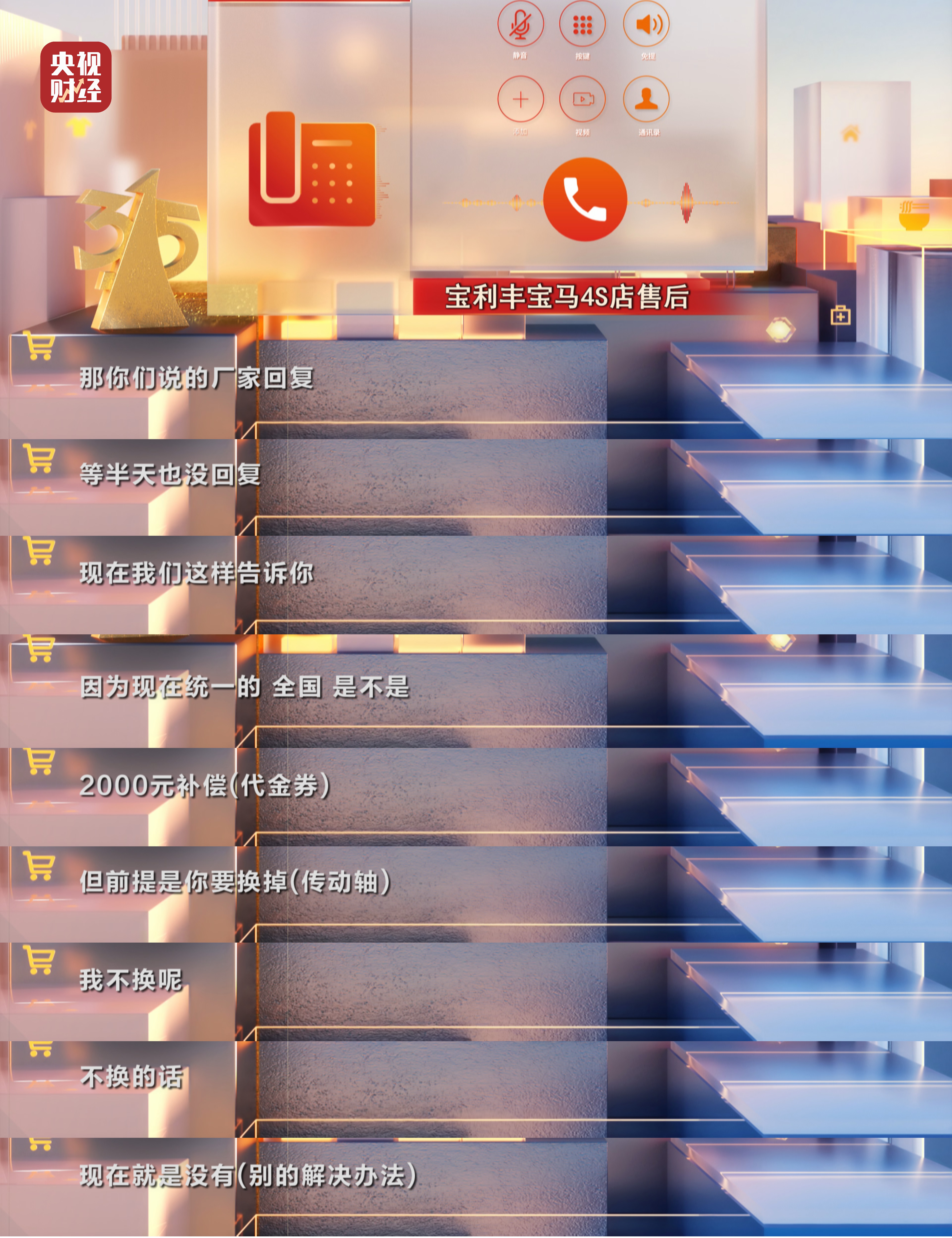 寶馬530Li車主 陳先生:給了2000元的代金券更換傳動(dòng)軸,我完全接受不了。賠不賠償我覺得不重要,重要的是要保障傳動(dòng)軸沒有任何的安全隱患。