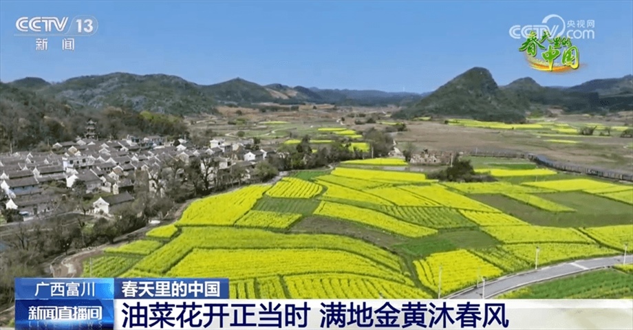 現(xiàn)在我們看到的是廣西富川瑤族自治縣的四萬多畝油菜。眼下,春意正濃,油菜進入盛花期,明艷的金黃色成了春日主色調(diào)。油菜花次第開放,清風(fēng)微拂,淡淡花香沁人心脾,花海與山巒、古村勾勒出一幅田園春景圖,吸引不少游客前來賞花踏青,感受春天的氣息。