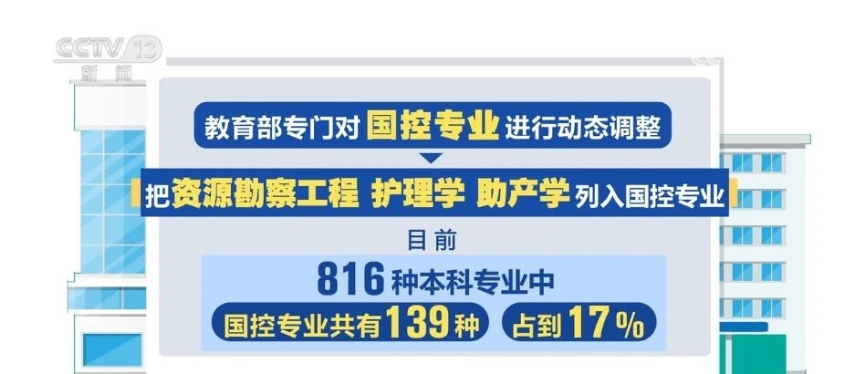 此次教育部專門對(duì)國(guó)控專業(yè)進(jìn)行了動(dòng)態(tài)調(diào)整,把資源勘察工程、護(hù)理學(xué)、助產(chǎn)學(xué)列入了國(guó)控專業(yè)。目前,816種本科專業(yè)中,國(guó)控專業(yè)共有139種,占到17%。未來,國(guó)控專業(yè)范圍還將進(jìn)行“有進(jìn)有出”的動(dòng)態(tài)調(diào)整。
