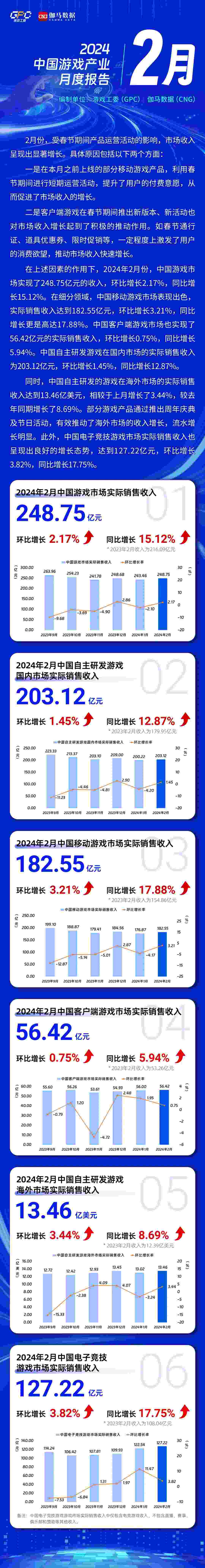 央視網(wǎng)消息:3月20日,據(jù)中國(guó)音數(shù)協(xié)游戲工委官微消息,2024年2月中國(guó)游戲產(chǎn)業(yè)月度報(bào)告發(fā)布。報(bào)告顯示,2024年2月份,中國(guó)游戲市場(chǎng)實(shí)現(xiàn)了248.75億元的收入,環(huán)比增長(zhǎng)2.17%,同比增長(zhǎng)15.12%。在細(xì)分領(lǐng)域,中國(guó)移動(dòng)游戲市場(chǎng)表現(xiàn)出色,實(shí)際銷(xiāo)售收入達(dá)到182.55億元,環(huán)比增長(zhǎng)3.21%,同比增長(zhǎng)更是高達(dá)17.88%。中國(guó)客戶(hù)端游戲市場(chǎng)也實(shí)現(xiàn)了56.42億元的實(shí)際銷(xiāo)售收入,環(huán)比增長(zhǎng)0.75%,同比增長(zhǎng)5.94%。中國(guó)自主研發(fā)游戲在國(guó)內(nèi)市場(chǎng)的實(shí)際銷(xiāo)售收入為203.12億元,環(huán)比增長(zhǎng)1.45%,同比增長(zhǎng)12.87%。