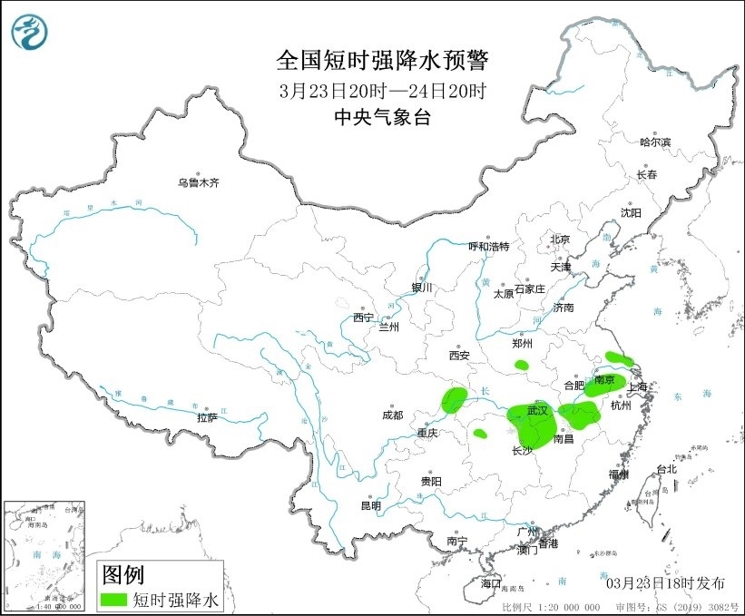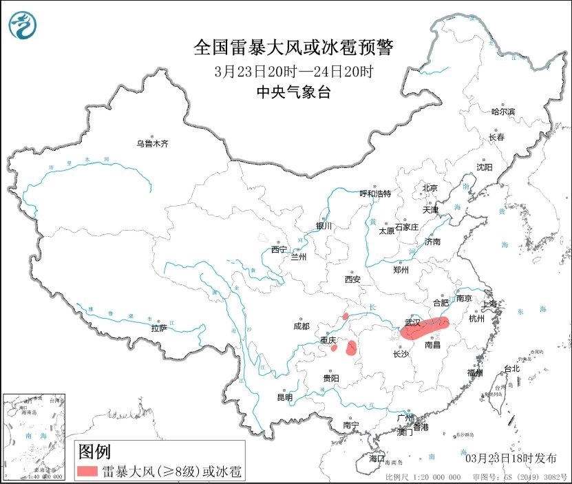 央視網(wǎng)消息:中央氣象臺3月23日18時繼續(xù)發(fā)布強對流天氣藍(lán)色預(yù)警。預(yù)計3月23日20時至24日20時,湖北東部、湖南北部、江西北部、重慶東南部、貴州北部等地的部分地區(qū)將有8-10級雷暴大風(fēng)或冰雹天氣;安徽南部、江蘇南部、湖北東南部、湖南東北部、江西北部、浙江北部、重慶北部等地的部分地區(qū)將有短時強降水天氣,最大小時雨量20-40毫米,局地可達(dá)50毫米以上。