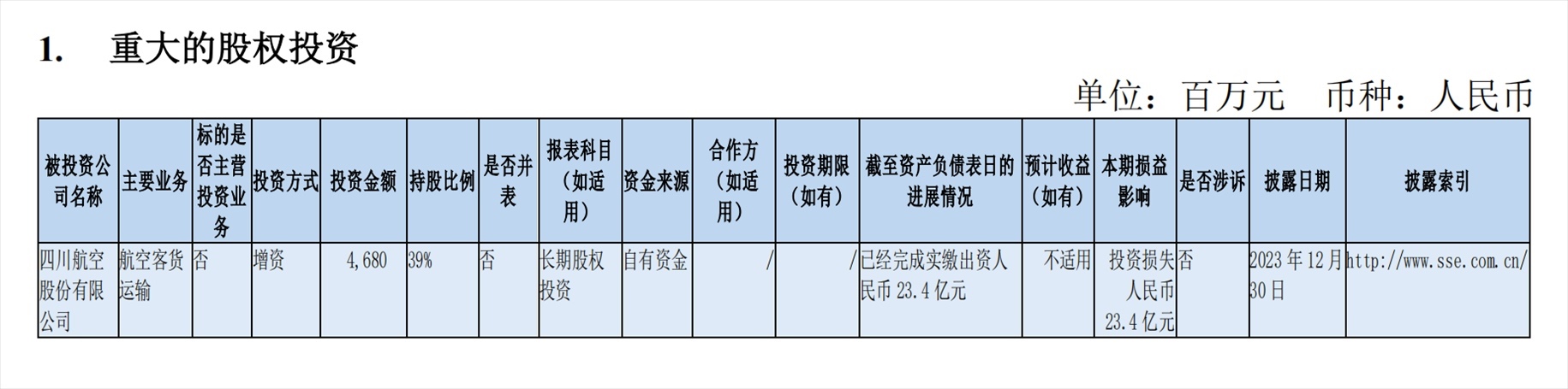 南方航空副董事長、總經(jīng)理韓文勝在3月29日的業(yè)績說明會上也提到,四川航空前期未確認的損失自2021年6月開始形成,截至2023年12月31日增資當期,確認虧損23.4億元,尚未確認26.6億元。投資損失產(chǎn)生的原因主要是疫情期間四川航空累計經(jīng)營虧損,超出南航對四川航空的投資成本。