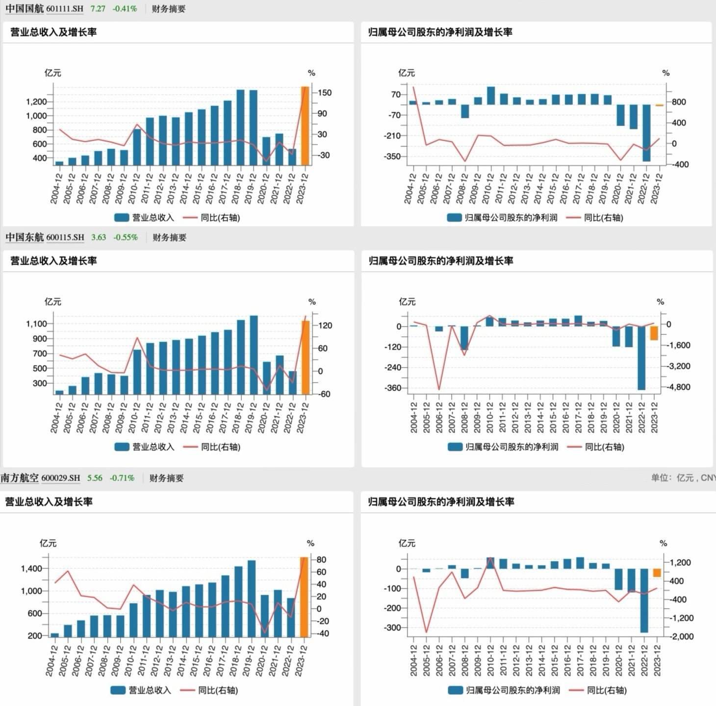 截至3月28日晚間,中國國航(601111.SH)、中國東航(600115.SH)、南方航空(600029.SH)陸續(xù)披露完2023年年報。三大航空央企2023年營業(yè)收入總計為4147.7億元,同比增長超1.2倍;歸母凈虧損總計134.23億元,同比收窄近九成。