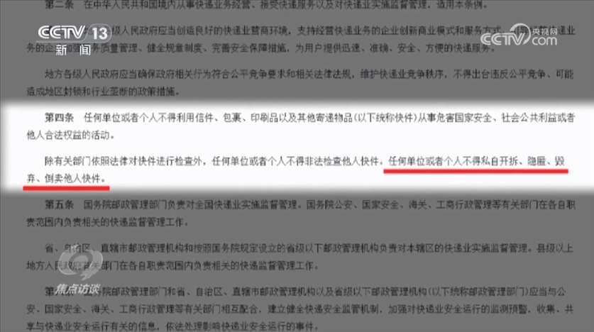 國(guó)務(wù)院頒布的《快遞暫行條例》第四條明確規(guī)定:“任何單位或者個(gè)人不得私自開(kāi)拆、隱匿、毀棄、倒賣他人快件。”