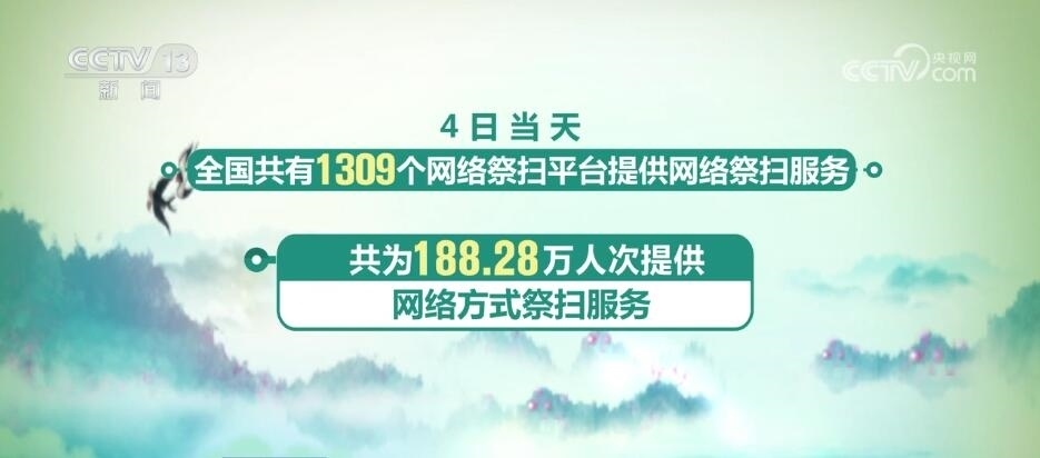 另外,4月4日當天全國共有1309個網(wǎng)絡祭掃平臺提供網(wǎng)絡祭掃服務,共為188.28萬人次提供網(wǎng)絡方式祭掃服務。