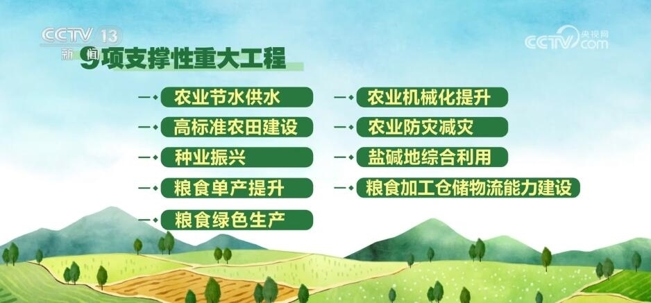 與此同時(shí),《方案》還圍繞糧食生產(chǎn)的關(guān)鍵領(lǐng)域和薄弱環(huán)節(jié),謀劃部署了農(nóng)業(yè)節(jié)水供水、高標(biāo)準(zhǔn)農(nóng)田建設(shè)、種業(yè)振興、糧食單產(chǎn)提升、糧食綠色生產(chǎn)、農(nóng)業(yè)機(jī)械化提升、農(nóng)業(yè)防災(zāi)減災(zāi)、鹽堿地綜合利用、糧食加工倉(cāng)儲(chǔ)物流能力建設(shè)等9項(xiàng)支撐性重大工程。
