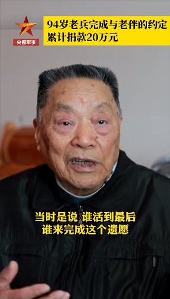 94歲老兵曾讓泉,78歲簽下捐贈(zèng)眼角膜協(xié)議,85歲開始捐款,至今共計(jì)20萬(wàn)元。曾讓泉說(shuō),老伴2014年走了,當(dāng)時(shí)約定誰(shuí)活到最后誰(shuí)來(lái)完成每年省下錢來(lái)捐款這個(gè)遺愿。