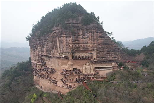 4月5日,游客在位于天水市麥積區(qū)的麥積山石窟游覽(無(wú)人機(jī)照片)。新華社 圖