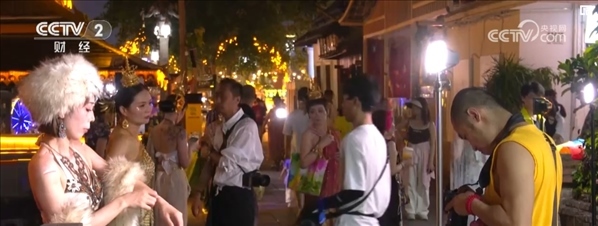 夜幕降臨,在西雙版納景洪市的告莊景區(qū)里,很多游客身著民族服飾,化著精致的妝容,正在攝影師的指導下拍攝寫真。