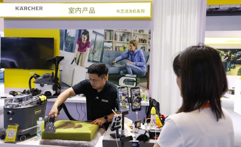 “友友們,現(xiàn)在進(jìn)入‘云’逛消博會(huì)時(shí)間,大家可以通過(guò)直播試擦,感受這款鏡面清潔機(jī)的功能?!币贿呍谡古_(tái)發(fā)布新品,一邊引導(dǎo)消費(fèi)者進(jìn)入直播間購(gòu)買,卡赫現(xiàn)場(chǎng)工作人員陳女士忙得不亦樂(lè)乎。據(jù)她介紹,這是公司第一次在消博會(huì)上使用直播帶貨形式,“效果不錯(cuò),剛剛就有不少粉絲下單”。