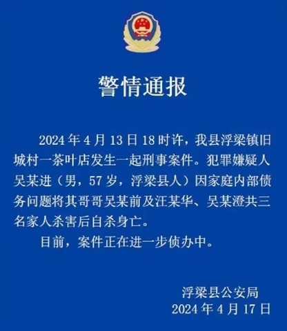 ·警方通報(bào)“知名茶企老板一家三口遇害案”:犯罪嫌疑人因家庭內(nèi)部債務(wù)問(wèn)題將其哥哥吳某前等三名家人殺害后自殺身亡。
