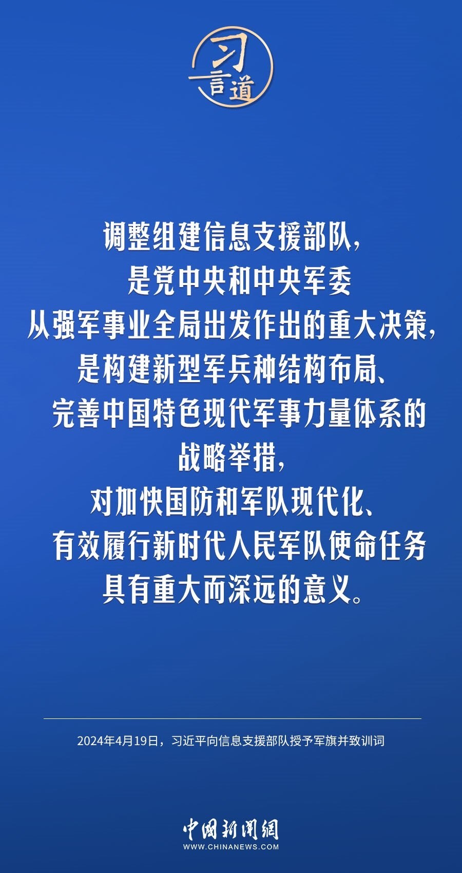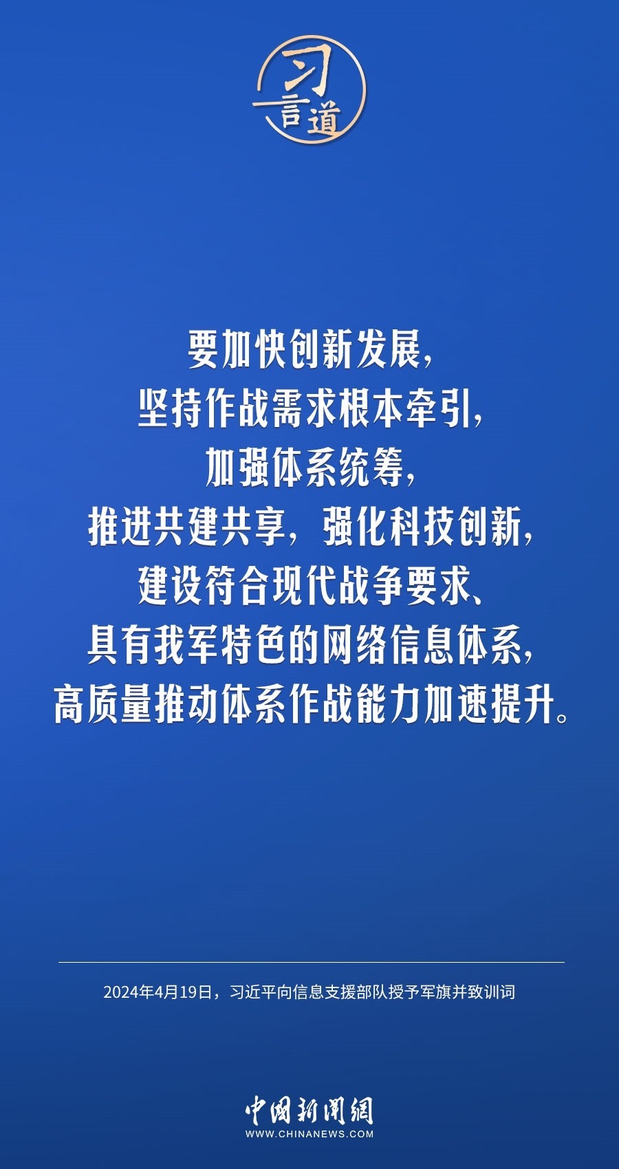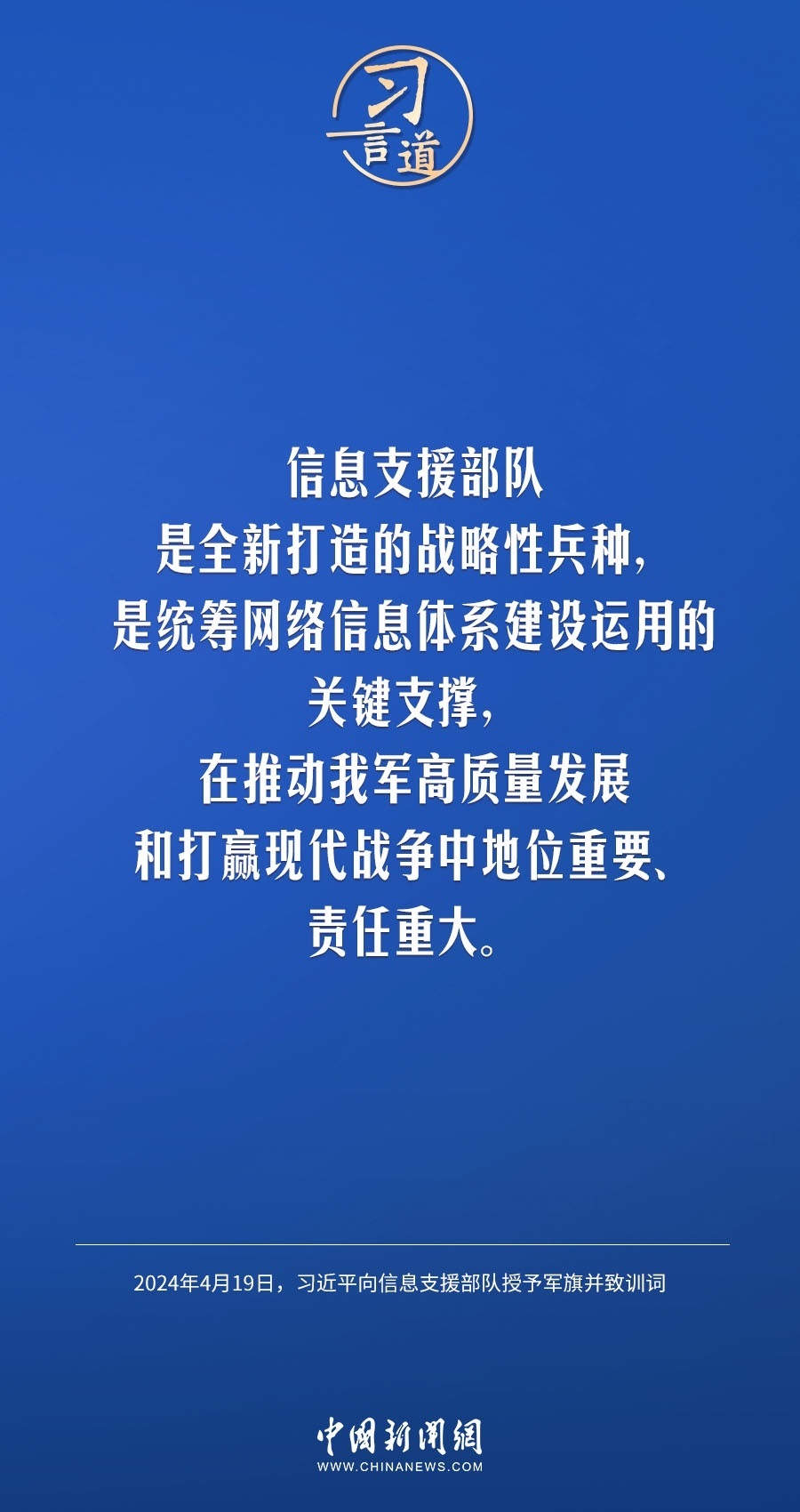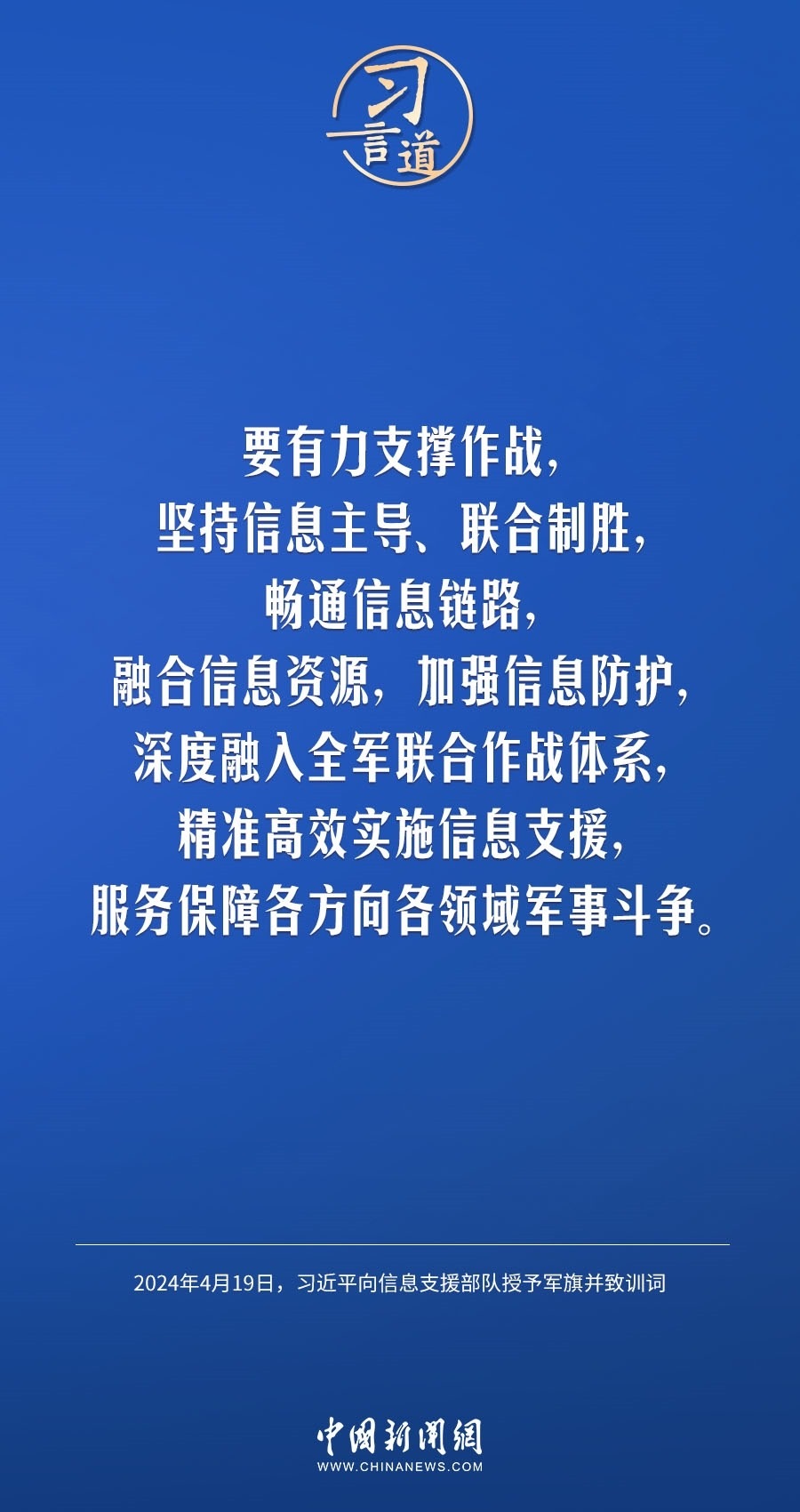 中國(guó)人民解放軍信息支援部隊(duì)成立大會(huì)19日在北京八一大樓隆重舉行。中共中央總書記、國(guó)家主席、中央軍委主席習(xí)近平向信息支援部隊(duì)授予軍旗并致訓(xùn)詞,代表黨中央和中央軍委向信息支援部隊(duì)全體官兵致以熱烈祝賀。他強(qiáng)調(diào)——