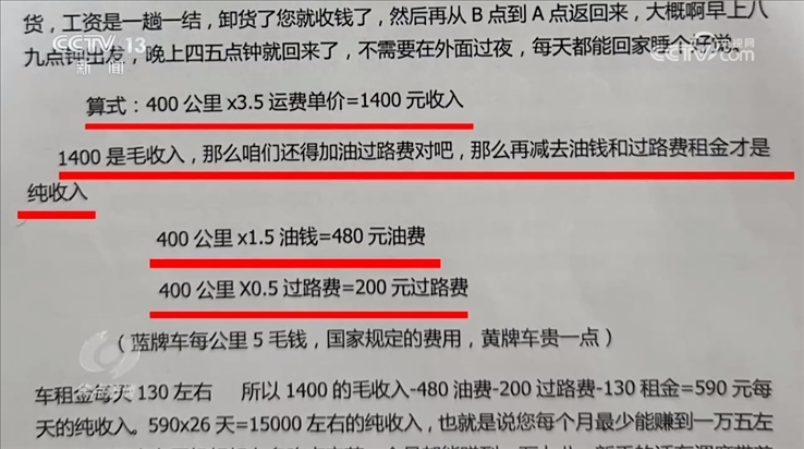 這些公司在和司機(jī)簽約時,根據(jù)司機(jī)個人情況的不同,對他們收取幾千元到幾萬元不等的費(fèi)用。還沒掙錢就先交錢,而且交的還不少,司機(jī)們?yōu)槭裁磿母是樵傅亟贿@些錢呢?因?yàn)槊嬖嚂r,公司給司機(jī)們詳細(xì)算過他們的收入。