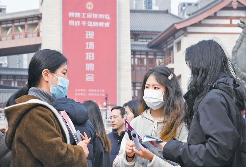 2024年3月6日,由陜西省總工會舉辦的2024年陜西工會“春送崗位”就業(yè)服務(wù)月啟動儀式在西安舉行。與啟動儀式同期舉辦的現(xiàn)場招聘會吸引約200家用人單位參加,提供崗位超過5000個。圖為當日求職者在現(xiàn)場招聘會上與企業(yè)工作人員交流。 新華社記者 張博文/攝