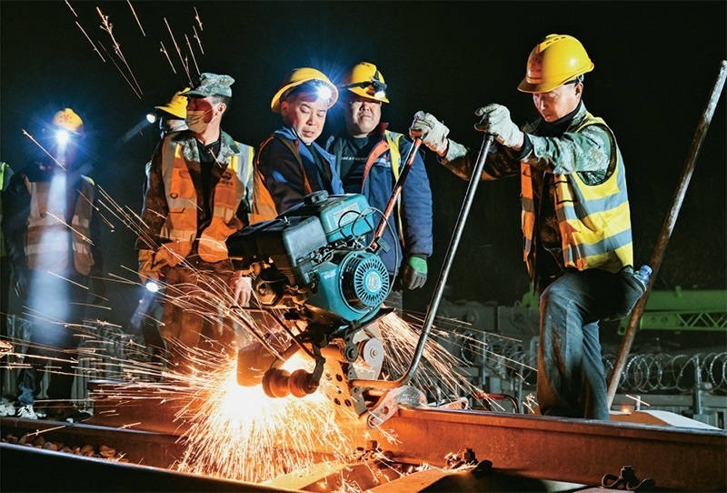 2024年4月10日,在內(nèi)蒙古包頭市,包銀高鐵引入包頭樞紐工程的關(guān)鍵控制性工程之一——包西上行線路撥接完成施工。此次施工完成,標志著包銀高鐵引入包頭樞紐包頭站改造工程取得重大進展,為包銀高鐵開通奠定堅實基礎(chǔ)。圖為4月10日凌晨,工人在包西上行線路上作業(yè)。 新華社記者 劉磊/攝