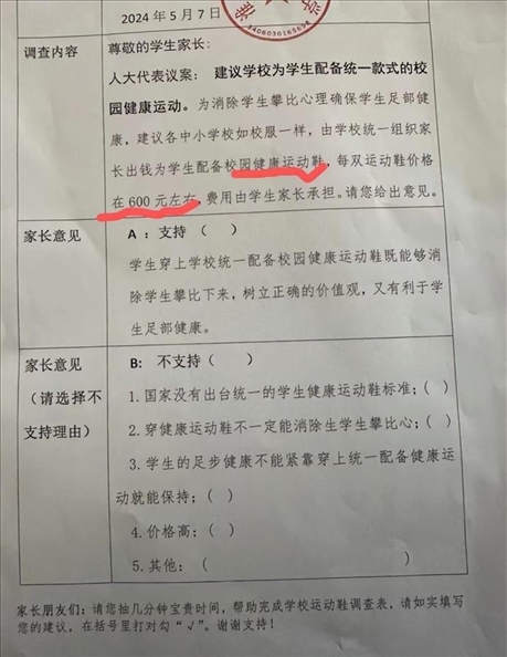 ·學(xué)校發(fā)調(diào)查表詢問(wèn)家長(zhǎng)“是否支持統(tǒng)一購(gòu)置約600元一雙的運(yùn)動(dòng)鞋”,淮北市教育局澄清:只是采集信息,沒其他意圖。