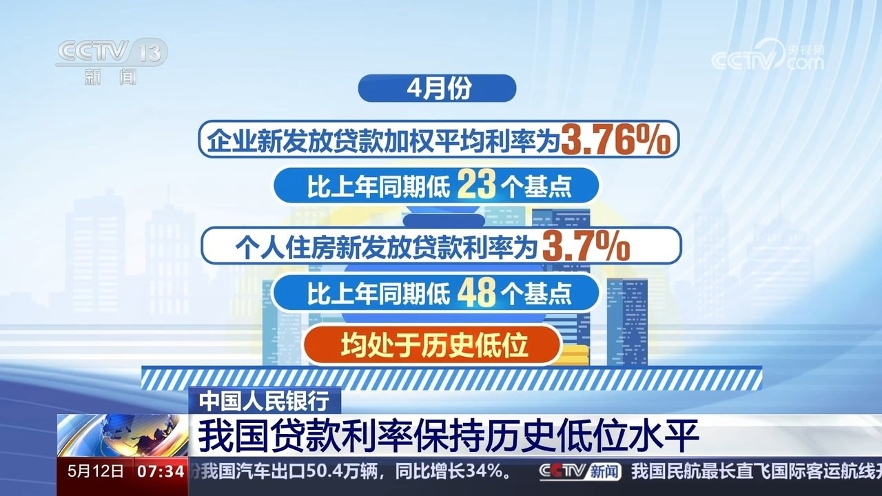 4月份企業(yè)新發(fā)放貸款加權(quán)平均利率為3.76%,比上年同期低23個基點(diǎn);個人住房新發(fā)放貸款利率為3.7%,比上年同期低48個基點(diǎn),均處于歷史低位。?