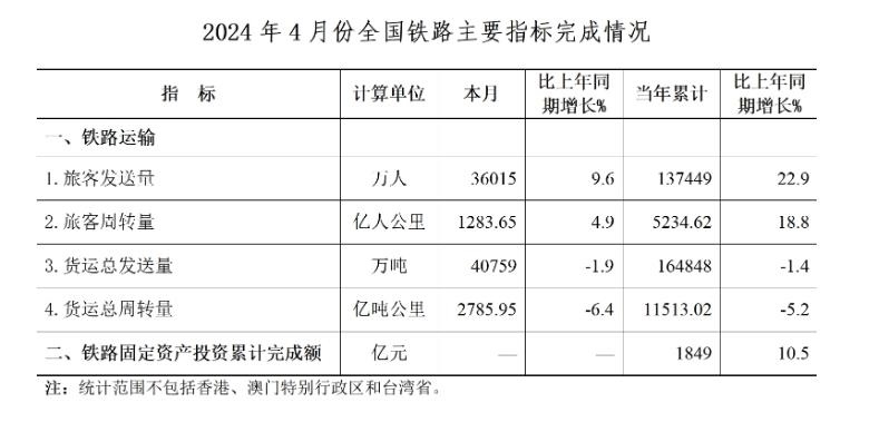 央視網(wǎng)消息:據(jù)國家鐵路局消息,4月,全國鐵路旅客發(fā)送量36015萬人,同比增長9.6%。鐵路固定資產(chǎn)投資累計(jì)完成1849億元,同比增長10.5%。