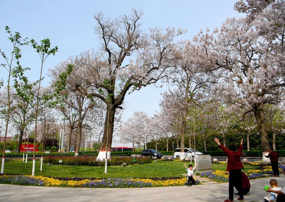 2024年4月16日,人們在焦裕祿干部學(xué)院門口的“焦桐”廣場參觀游玩。新華社記者 郝源 攝
