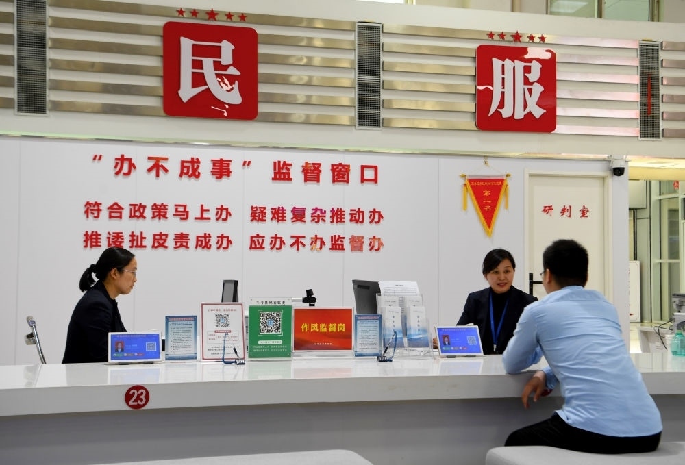 2024年4月18日,群眾在蘭考縣為民服務(wù)中心“辦不成事”監(jiān)督窗口辦理業(yè)務(wù)。新華社記者 郝源 攝
